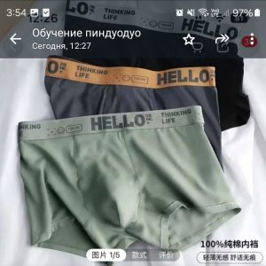 Мужское нижнее белье – боксеры из мягкого хлопка зеленого цвета с яркой надписью Hello". Эластичный пояс обеспечивает комфорт при носке."