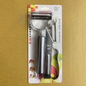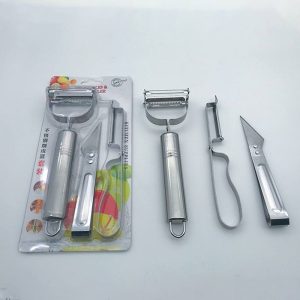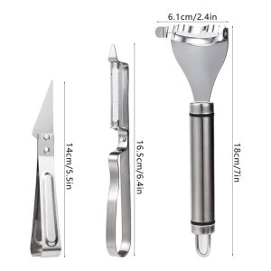 В набор входят три ножа разного размера и формы для всех этапов обработки овощей: большой — для чистки картофеля и тыквы, средний — для фруктов, маленький — для деликатной работы и удаления глазков. Лезвия из нержавеющей стали не ржавеют и долго остаются острыми.