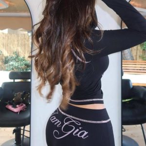"Сексуальный комплект из двух предметов: брюки с низкой посадкой и топ с перевернутым дизайном и буквенным принтом. Создает образ ""горячей штучки"". Идеален для вечеринок