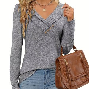 Женская блузка с V-образным вырезом и пуговицами — стильная, с длинным рукавом, удобна для повседневной носки. - TAOBEY