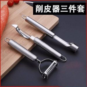 В набор входят три ножа разного размера и формы для всех этапов обработки овощей: большой — для чистки картофеля и тыквы, средний — для фруктов, маленький — для деликатной работы и удаления глазков. Лезвия из нержавеющей стали не ржавеют и долго остаются острыми.