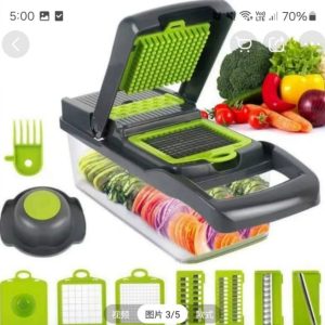 Овощерезка-терка с прозрачным контейнером для сбора нарезанных продуктов. Несколько насадок для разной нарезки (соломка, кубики и т.д.). Удобна и безопасна в использовании.
